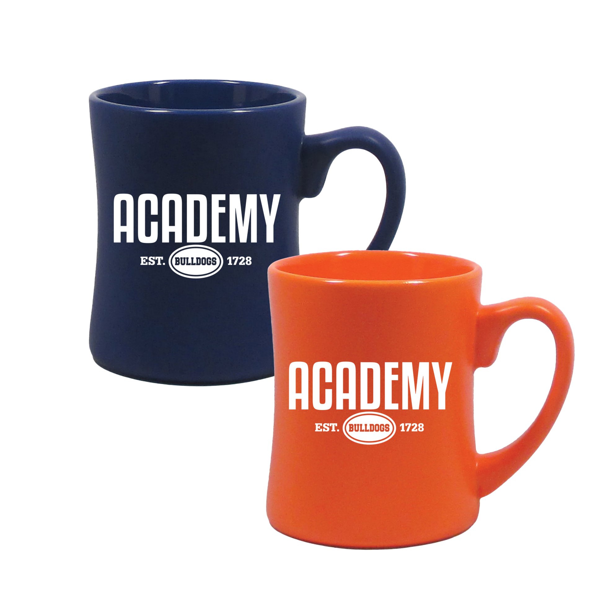 Navy or orange military mug featuring Academy Bulldogs Est. 1728 printed on one side.
